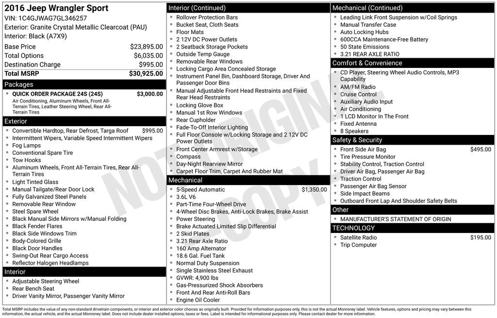 2016 Jeep Wrangler Sport Granite Crystal Metallic Clearcoat Sport 4WD 5-Speed Automatic 3.6L V6 24V VVT 1-Yr SiriusXM Radio Service, 16" x 7.0" Luxury Styled Steel Wheels, 17" x 7.5" Aluminum Wheels, 3.21 Rear Axle Ratio, 4-Wheel Disc Brakes, 8 Speakers, ABS brakes, Air Conditioning, AM/FM radio, Audio Jack Input for Mobile Devices, Black 3-Piece Hard Top, Brake assist, CD player, Chrome/Leather Wrapped Shift Knob, Cloth Seats w/Adjustable Head Restraints, Compass, Delete Sunrider Soft Top, Driver door bin, Driver vanity mirror, Dual front impact airbags, Electronic Stability Control, Freedom Panel Storage Bag, Front anti-roll bar, Front Bucket Seats, Front Center Armrest w/Storage, Front fog lights, Integrated roll-over protection, Leather Wrapped Steering Wheel, Low tire pressure warning, Manufacturer's Statement of Origin, Normal Duty Suspension, Occupant sensing airbag, Outside temperature display, Passenger door bin, Passenger vanity mirror, Power steering, Quick Order Package 24S, Radio: 130, Rear anti-roll bar, Rear Window Defroster, Rear Window Wiper/Washer, SIRIUS Satellite Radio, Speed control, Steering wheel mounted audio controls, Sunrider Soft Top, Supplemental Front Seat Side Airbags, Tachometer, Tilt steering wheel, Tinted Rear Quarter & Liftgate Windows, Traction control, Trip computer, Variably intermittent wipers.