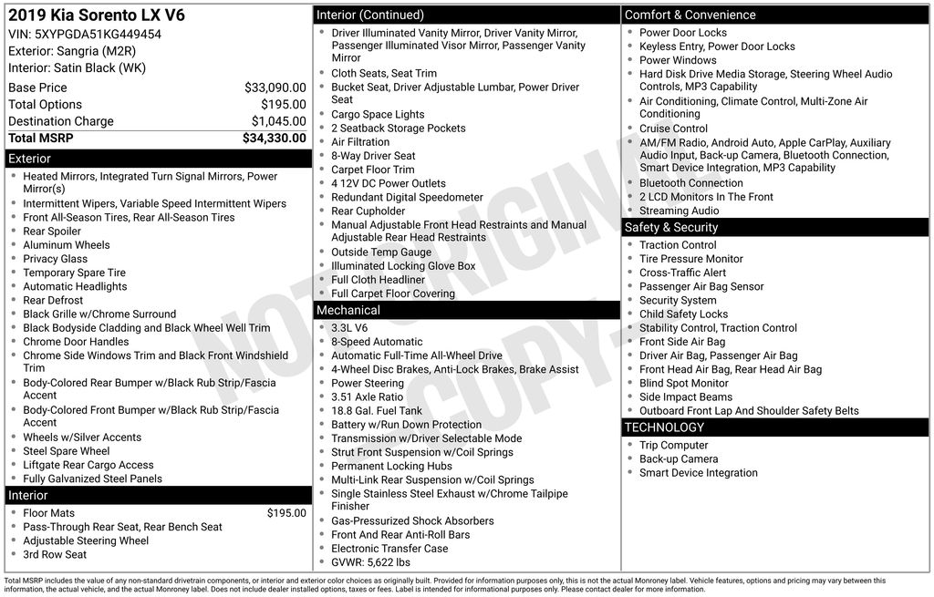 Looking for a dependable and affordable SUV with space for the family? This 2019 Kia Sorento LX AWD in eye-catching Sangria with a comfortable black cloth interior has you covered. Powered by a 3.3L V6 engine paired with an 8-speed automatic transmission, it delivers smooth performance with the confidence of all-wheel drive.