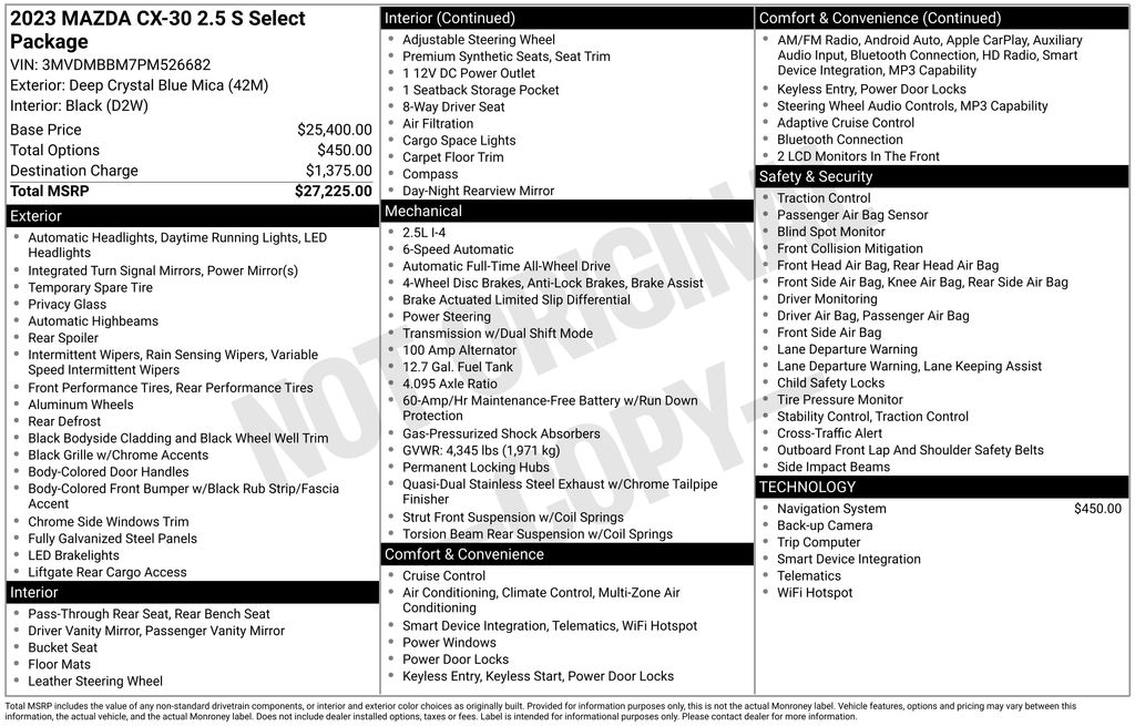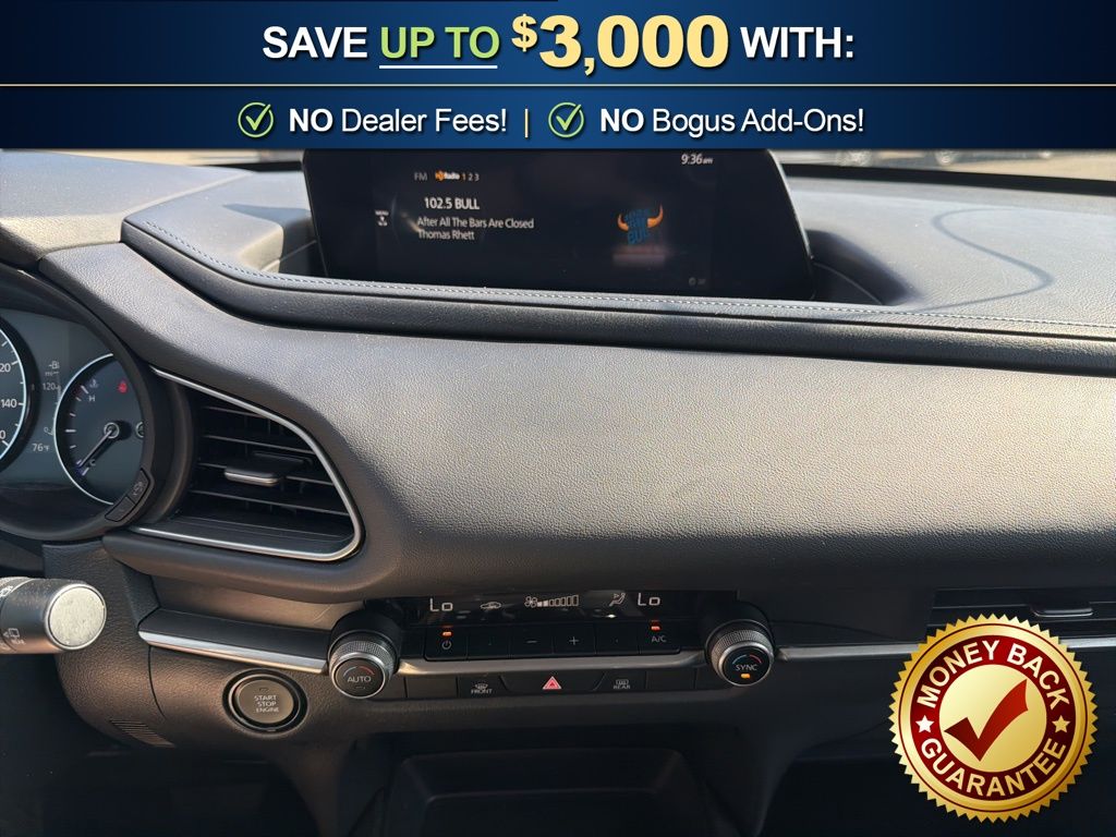 4-Wheel Disc Brakes, 4.095 Axle Ratio, 8 Speakers, ABS brakes, Air Conditioning, Alloy wheels, AM/FM radio, AppLink/Apple CarPlay and Android Auto, Auto High-beam Headlights, Automatic temperature control, Brake assist, Bumpers: body-color, Compass, Delay-off headlights, Driver door bin, Driver vanity mirror, Dual front impact airbags, Dual front side impact airbags, Electronic Stability Control, Emergency communication system: Mazda Connected Services (3-year complimentary trial included), Exterior Parking Camera Rear, Front anti-roll bar, Front Bucket Seats, Front Center Armrest, Front dual zone A/C, Front reading lights, Front wheel independent suspension, Fully automatic headlights, Illuminated entry, Knee airbag, Leather Shift Knob, Leather steering wheel, Leatherette Seat Trim, Low tire pressure warning, MAZDA CONNECT Infotainment System, Mazda Navigation System, Occupant sensing airbag, Outside temperature display, Overhead airbag, Panic alarm, Passenger door bin, Passenger vanity mirror, Power door mirrors, Power steering, Power windows, Radio data system, Radio: AM/FM/HD Audio System, Rain sensing wipers, Rear seat center armrest, Rear side impact airbag, Rear window defroster, Rear window wiper, Remote keyless entry, Speed control, Speed-sensing steering, Split folding rear seat, Spoiler, Steering wheel mounted audio controls, Tachometer, Telescoping steering wheel, Tilt steering wheel, Traction control, Trip computer, Turn signal indicator mirrors, Variably intermittent wipers, Wheels: 18" x 7J Aluminum Alloy. 2023 Mazda CX-30 2.5 S Select Package