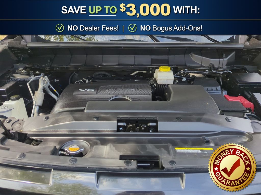 4WD, 18" Machined Alloy Wheels, 3rd row seats: bench, 4-Wheel Disc Brakes, 6 Speakers, ABS brakes, Air Conditioning, Alloy wheels, AM/FM radio: SiriusXM, Auto High-beam Headlights, Auto-dimming Rear-View mirror, Automatic temperature control, Axle Ratio: 4.334, Bench Seat Carpeted Floor Mats (Set of 4), Brake assist, Bumpers: body-color, Delay-off headlights, Driver door bin, Driver vanity mirror, Dual front impact airbags, Dual front side impact airbags, Electronic Stability Control, Emergency communication system: NissanConnect Services, Exterior Parking Camera Rear, Four wheel independent suspension, Front anti-roll bar, Front Bucket Seats, Front Center Armrest, Front dual zone A/C, Front reading lights, Fully automatic headlights, Garage door transmitter: HomeLink, Heated door mirrors, Heated Front Bucket Seats, Heated front seats, Heated steering wheel, Illuminated entry, Knee airbag, Leather Seating Surfaces, Leather steering wheel, LED Fog Lamps, Low tire pressure warning, Navigation system: NissanConnect Navigation, NissanConnect w/Navigation & Services, Occupant sensing airbag, Outside temperature display, Overhead airbag, Overhead console, Panic alarm, Passenger door bin, Passenger vanity mirror, Power door mirrors, Power driver seat, Power Liftgate, Power passenger seat, Power steering, Power windows, Radio data system, Radio: AM/FM Audio System, Rear air conditioning, Rear anti-roll bar, Rear reading lights, Rear seat center armrest, Rear side impact airbag, Rear window defroster, Rear window wiper, Reclining 3rd row seat, Remote keyless entry, Security system, Speed control, Speed-sensing steering, Split folding rear seat, Spoiler, Steering wheel mounted audio controls, Tachometer, Telescoping steering wheel, Tilt steering wheel, Traction control, Trip computer, Turn signal indicator mirrors, Variably intermittent wipers, 4WD.