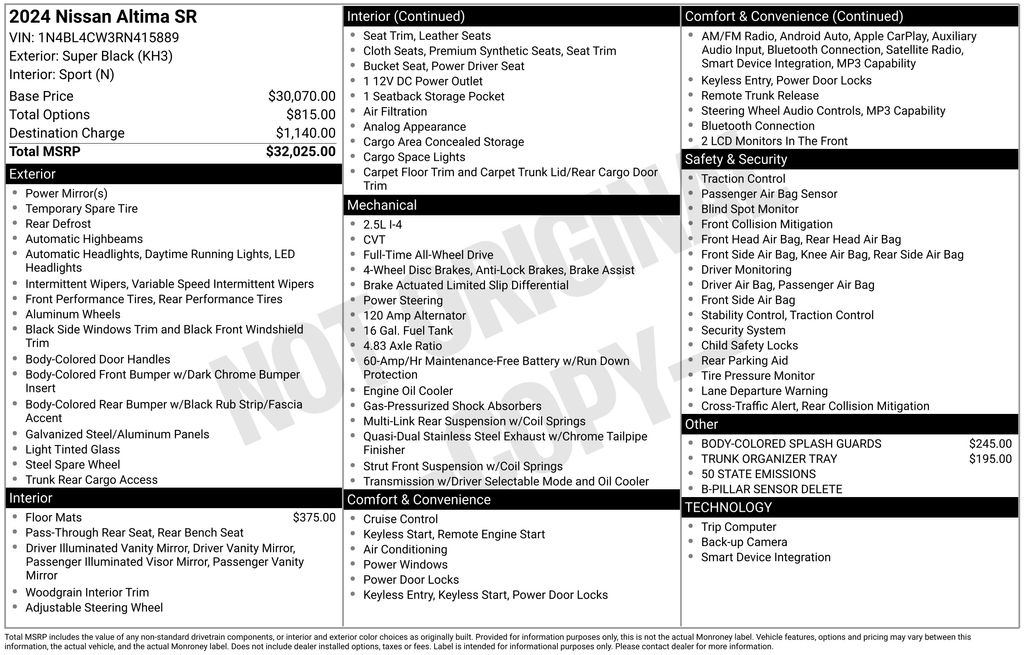 2024 Nissan Altima 2.5 SR Super Black Clearcoat 2.5 SR AWD CVT with Xtronic 2.5L 4-Cylinder DOHC 16V CVT with Xtronic, 4-Wheel Disc Brakes, 6 Speakers, ABS brakes, Air Conditioning, Alloy wheels, AM/FM radio: SiriusXM, Auto High-beam Headlights, B-Pillar Sensor Delete, Blind Spot Warning, Body-Colored Splash Guards, Brake assist, Bumpers: body-color, Delay-off headlights, Driver door bin, Driver vanity mirror, Dual front impact airbags, Dual front side impact airbags, Electronic Stability Control, Four wheel independent suspension, Front anti-roll bar, Front Bucket Seats, Front Center Armrest, Front reading lights, Fully automatic headlights, Illuminated entry, Knee airbag, Leather Shift Knob, Low tire pressure warning, NissanConnect featuring Apple CarPlay, Occupant sensing airbag, Outside temperature display, Overhead airbag, Overhead console, Panic alarm, Passenger door bin, Passenger vanity mirror, Power door mirrors, Power driver seat, Power steering, Power windows, Radio data system, Radio: AM/FM Audio System, Rear anti-roll bar, Rear Parking Sensors, Rear reading lights, Rear seat center armrest, Rear side impact airbag, Rear window defroster, Remote keyless entry, Security system, Speed control, Speed-sensing steering, Speed-Sensitive Wipers, Split folding rear seat, Sport Seat Trim, SR Floor Mats/Trunk Mat/Hideaway Nets, Steering wheel mounted audio controls, Tachometer, Telescoping steering wheel, Tilt steering wheel, Traction control, Trip computer, Trunk Organizer Tray, Unique Sport Seats, Variably intermittent wipers, Wheels: 19" Sport Alloy, CVT with Xtronic.