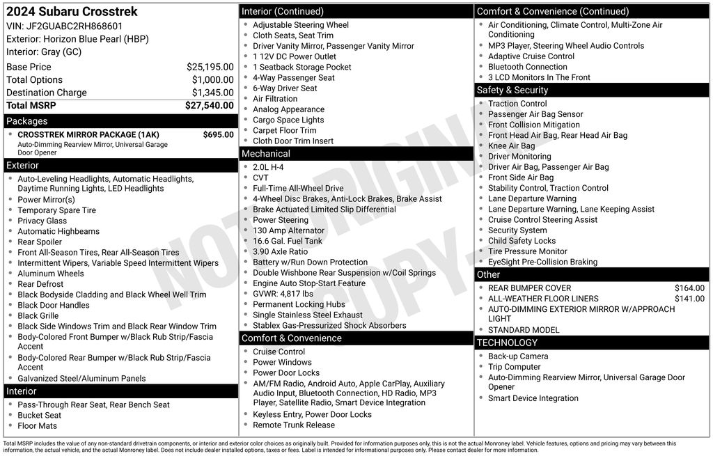 3.90 Axle Ratio, 4 Speakers, 4-Wheel Disc Brakes, ABS brakes, Air Conditioning, All-Weather Floor Liners, Alloy wheels, AM/FM radio: SiriusXM, Anti-whiplash front head restraints, Auto High-beam Headlights, Auto-Dimming Exterior Mirror w/Approach Light, Auto-Dimming Mirror w/Compass & HomeLink, Automatic temperature control, Brake assist, Bumpers: body-color, Cloth Upholstery, Crosstrek Mirror Package, Driver door bin, Driver vanity mirror, Dual front impact airbags, Dual front side impact airbags, Electronic Stability Control, Exterior Parking Camera Rear, Four wheel independent suspension, Front anti-roll bar, Front Bucket Seats, Front Center Armrest, Front dual zone A/C, Front reading lights, Fully automatic headlights, Illuminated entry, Knee airbag, Low tire pressure warning, Occupant sensing airbag, Outside temperature display, Overhead airbag, Overhead console, Panic alarm, Passenger door bin, Passenger vanity mirror, Power door mirrors, Power steering, Power windows, Radio data system, Radio: Subaru STARLINK Dual 7.0" Multimedia System, Rear anti-roll bar, Rear Bumper Cover, Rear window defroster, Rear window wiper, Remote keyless entry, Security system, Speed control, Speed-sensing steering, Split folding rear seat, Spoiler, Standard Model, STARLINK/Apple CarPlay/Android Auto, Steering wheel mounted audio controls, Tachometer, Telescoping steering wheel, Tilt steering wheel, Traction control, Trip computer, Variably intermittent wipers, Wheels: 17" x 7.0J Dark Gray Aluminum Alloy. 2024 Subaru Crosstrek Base