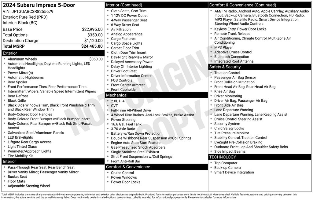 4 Speakers, 4-Wheel Disc Brakes, ABS brakes, Air Conditioning, Alloy Wheels, AM/FM radio: SiriusXM, Anti-whiplash front head restraints, Auto High-beam Headlights, Automatic temperature control, Brake assist, Bumpers: body-color, Cloth Upholstery, Driver door bin, Driver vanity mirror, Dual front impact airbags, Dual front side impact airbags, Electronic Stability Control, Exterior Parking Camera Rear, Four wheel independent suspension, Front anti-roll bar, Front Bucket Seats, Front Center Armrest, Front dual zone A/C, Front reading lights, Fully automatic headlights, Illuminated entry, Knee airbag, Low tire pressure warning, Occupant sensing airbag, Outside temperature display, Overhead airbag, Overhead console, Panic alarm, Passenger door bin, Passenger vanity mirror, Power door mirrors, Power steering, Power windows, Radio data system, Radio: Subaru STARLINK Dual 7.0" Multimedia System, Rear window defroster, Rear window wiper, Remote keyless entry, Security system, Speed control, Speed-sensing steering, Split folding rear seat, Spoiler, STARLINK/Apple CarPlay/Android Auto, Steering wheel mounted audio controls, Tachometer, Telescoping steering wheel, Tilt steering wheel, Traction control, Trip computer, Variably intermittent wipers, Wheels: 16" x 6.0" Full Cap 1/2 J Steel. 2024 Subaru Impreza Base