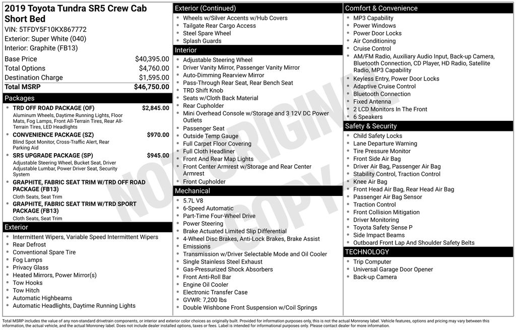 4WD, 4-Wheel Disc Brakes, ABS brakes, Air Conditioning, AM/FM radio: SiriusXM, Auto High-beam Headlights, Auto-dimming Rear-View mirror, Brake assist, CD player, Compass, Delay-off headlights, Driver door bin, Driver vanity mirror, Dual front impact airbags, Dual front side impact airbags, Electronic Stability Control, Exterior Parking Camera Rear, Front anti-roll bar, Front Bucket Seats, Front fog lights, Front reading lights, Front wheel independent suspension, Fully automatic headlights, Garage door transmitter: HomeLink, Heated door mirrors, Illuminated entry, Knee airbag, Low tire pressure warning, Occupant sensing airbag, Outside temperature display, Overhead airbag, Overhead console, Panic alarm, Passenger door bin, Passenger vanity mirror, Power door mirrors, Power steering, Power windows, Rear reading lights, Rear seat center armrest, Rear step bumper, Rear window defroster, Remote keyless entry, Speed control, Speed-sensing steering, Split folding rear seat, Tachometer, Tilt steering wheel, Traction control, Trip computer, Variably intermittent wipers, Voltmeter, 4WD. 2019 Toyota Tundra
