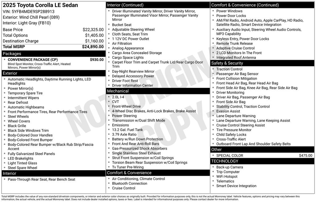 2025 Toyota Corolla LE Pearl LE FWD CVT 2.0L I4 DOHC 16V 4-Wheel Disc Brakes, 6 Speakers, ABS brakes, Air Conditioning, AM/FM radio: SiriusXM, Apple CarPlay/Android Auto, Auto High-beam Headlights, Automatic temperature control, Blind Spot Monitor, Brake assist, Bumpers: body-color, Color-Keyed Heated Power Outside Mirrors, Convenience Package, Delay-off headlights, Driver door bin, Driver vanity mirror, Dual front impact airbags, Dual front side impact airbags, Electronic Stability Control, Emergency communication system: Safety Connect (up to 10-year trial subscription), Exterior Parking Camera Rear, Fabric Seat Trim, Front anti-roll bar, Front Bucket Seats, Front Center Armrest, Front reading lights, Front wheel independent suspension, Fully automatic headlights, Illuminated entry, Knee airbag, Low tire pressure warning, Occupant sensing airbag, Outside temperature display, Overhead airbag, Panic alarm, Passenger door bin, Passenger vanity mirror, Power door mirrors, Power steering, Power windows, Radio data system, Radio: 8" Toyota Audio Multimedia, Rear anti-roll bar, Rear seat center armrest, Rear side impact airbag, Rear window defroster, Remote keyless entry, Speed control, Split folding rear seat, Steering wheel mounted audio controls, Tachometer, Telescoping steering wheel, Tilt steering wheel, Traction control, Trip computer, Wheels: 16" Steel with Covers.