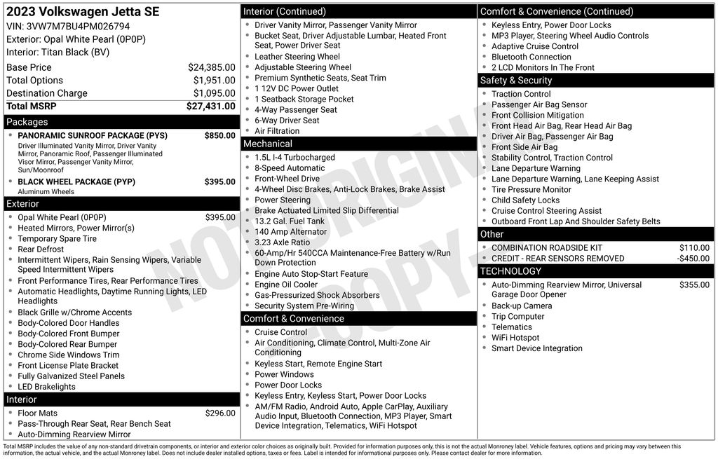 2023 Volkswagen Jetta 1.5T SE FWD 8-Speed Automatic with Tiptronic 1.5L I-4 DI DOHC Turbocharged Opal White