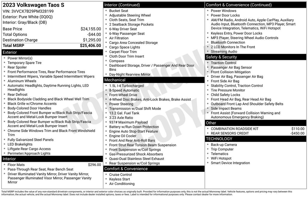 3.23 Axle Ratio, 4-Wheel Disc Brakes, 6 Speakers, ABS brakes, Air Conditioning, Alloy wheels, AM/FM radio, Brake assist, Bumpers: body-color, Cloth Seating Surfaces, Compass, Delay-off headlights, Driver door bin, Driver vanity mirror, Dual front impact airbags, Dual front side impact airbags, Electronic Stability Control, Emergency communication system: VW Car-Net Safe & Secure 5-year, Exterior Parking Camera Rear, Front anti-roll bar, Front Bucket Seats, Front Center Armrest, Front reading lights, Front Strut Rear Torsion Beam Suspension, Front wheel independent suspension, Fully automatic headlights, Illuminated entry, Low tire pressure warning, Occupant sensing airbag, Outside temperature display, Overhead airbag, Overhead console, Panic alarm, Passenger door bin, Passenger vanity mirror, Power door mirrors, Power steering, Power windows, Radio data system, Radio: Composition Color AM/FM, Rear anti-roll bar, Rear seat center armrest, Rear window defroster, Rear window wiper, Remote keyless entry, Roof rack: rails only, Speed control, Speed-sensing steering, Split folding rear seat, Spoiler, Steering wheel mounted audio controls, Tachometer, Telescoping steering wheel, Tilt steering wheel, Traction control, Trip computer, Variably intermittent wipers, Wheels: 17" Silver Painted Alloy. 2023 Volkswagen Taos 1.5T S